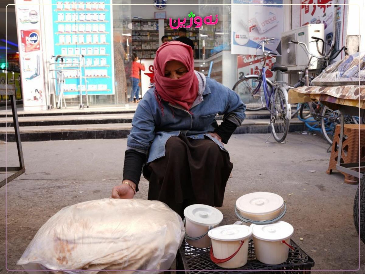 چاکەتێکی شینی پۆشیوە، لەچکە پەمەیەکەی لەبری دەمامک بەکارهێناوە، کۆمەڵێک خواردنی کوردەواری لە پێش خۆیداناوە، ئەمە دیمەنی ژنێکی تەمەن ٥٣ ساڵە لە کۆڵانێکی بازاڕی قەزای کەلار, کە ماوەی دو ساڵە کاری فرۆشیاری دەکات لە بازاڕەکە.