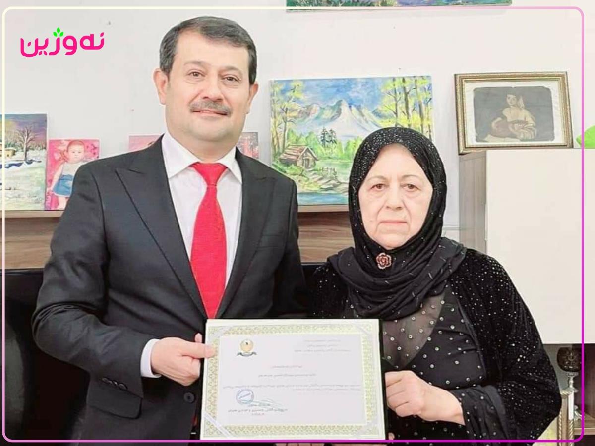 وەزارەتی رۆشنبیری و لاوان و پارێزگای هەولێر، بڕوانامەی رێزلێنانی بەخشیە یەکەم ئافرەتی شاری هەولێر، کە دەرچوی ئەکادیمیای هونەرە جوانەکانی بەغدا- بەشی شێوەکارییە، و زیاتر لە 50 ساڵە خزمەت بە پەروەردە و هونەر دەکات.