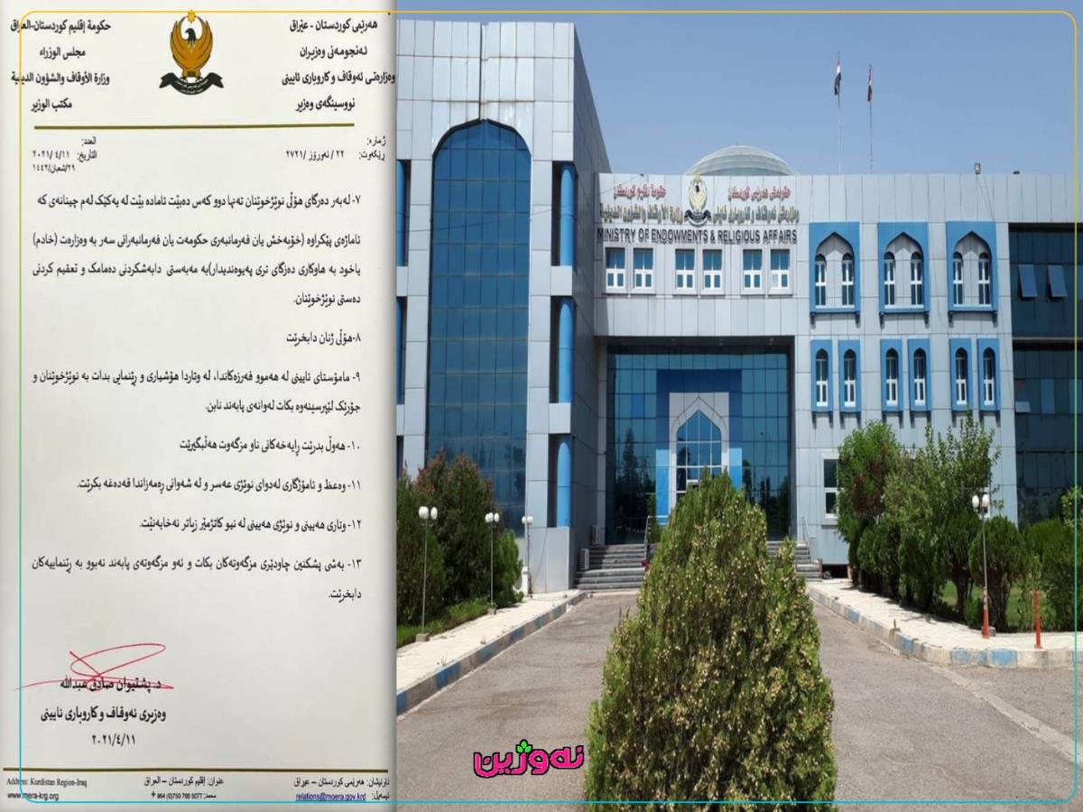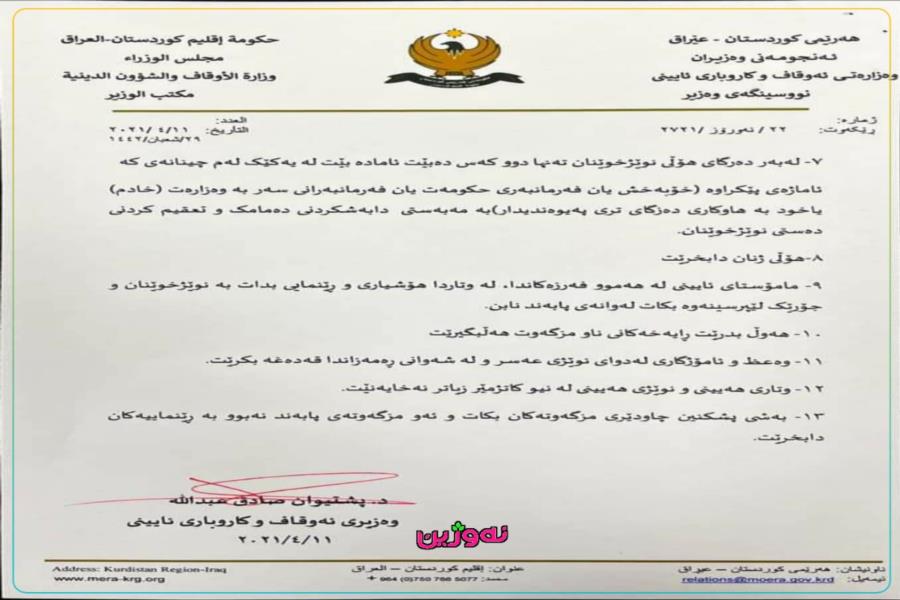 وەزارەتی ئەوقاف و کاروباری ئاینی رێکەوتی (١١/٤/٢٠٢١) نوسراوێکی بڵاوکردەوە سەبارەت بە ئەنجامدانی مەراسیمی نوێژی بەکۆمەڵ لە مزگەوتەکاندا، لە خاڵی هەشتەمیدا هاتوە کە هۆڵی ژنان بە داخراوی دەمێنێتەوە.