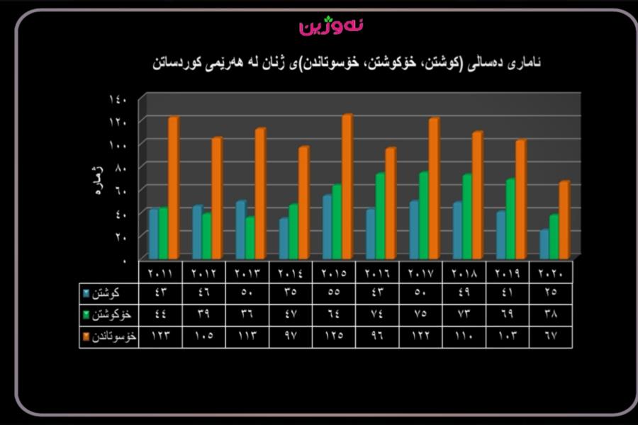 بەڕێوبەرایەتی گشتی بەرەنگاربوونەوەی توندوتیژی دژی ئافرەتان و خێزان، ئامارەکانی ساڵی رابردوی بڵاوکردوەو تێیدا هاتوە لە ساڵی ٢٠٢٠ لە هەرێمی کوردستان ٢٥ ژن کوژراون و ٣٨ ژن خۆیان کوشتوە لەگەڵ ٦٧ حاڵەتی خۆسوتاندنی ژنان.