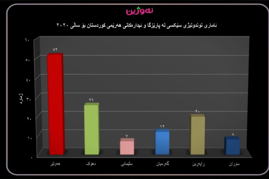 دوای دەساڵ بە (٢٥) حاڵەت کەمترین ژمارەی کوشتنی ژنان لە هەرێمی کوردستان تۆمارکرا لە ساڵی ٢٠٢٠دا بەشێوەیەک زۆرترین حاڵەت لە پارێزگای هەولێر، تۆمارکراوە کە (١٥) ژن لەو پارێزگایە کوژراون هاوکات ئیدارەی گەرمیانیش کەمترینە بە یەک حاڵەت.